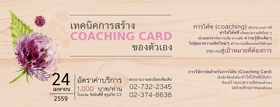 การโค้ช (coaching) เป็นกระบวนการที่ทำให้โค้ชชี่ เกิดแนวความคิดใหม่ๆ เพื่อออกจากความเชื่อ ความคิด ความรู้สึกเดิมๆไปสู่แนวความคิดใหม่ๆ สร้างการเปลี่ยนแปลงให้ตัวเอง มีวิธีการไปสู่เป้าหมายที่ต้องการ การใช้การ์ดสำหรับการโค้ช (Coaching Card) เป็นอีกวิธีหนึ่งที่จะทำให้โค้ชชี่มีอิสระที่จะสร้างแนวความคิดของตัวเองได้ด้วยศักยภาพของตัวเอง โค้ชสามารถสร้าง Coaching Card สำหรับตัวเอง ในการดำเนินการโค้ชตามกระบวนการได้ เช่น Positive Psychology Coaching Card Balancing Coaching Card Solution Coaching Card Changing Coaching Card Story Telling Coaching Card สิ่งที่จะได้เรียนรู้ หลักการสำคัญของการสร้าง Coaching Card เทคนิควิธีการใช้ Coaching Card อย่างมีประสิทธิภาพ กระบวนการสร้าง Coaching Card ด้วยตัวเอง รูปแบบการทำ Coaching Card ให้เป็นมาตรฐานการโค้ช กิจกรรม : การใช้ Coaching Card ของตัวเอง ดำเนินการโค้ช