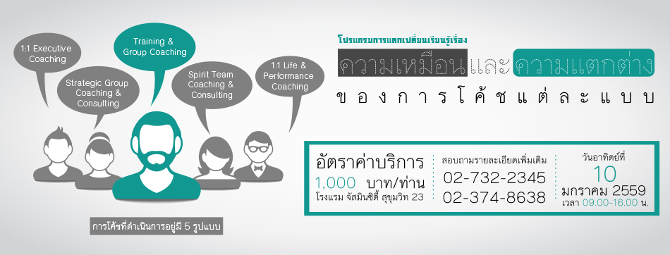 การโค้ช (Coaching) สามารถประยุกต์ใช้กับสถานการณ์ต่างๆ ได้หลากหลายกรณีขึ้นอยู่กับ วัตถุประสงค์ และบุคคลที่ต้องการรับการโค้ช การใช้หลักการและทักษะการโค้ช (Coaching Skill) ในการพัฒนาบุคลากรและทีมงานเป็นอีกวิธีหนึ่งที่องค์กรต่างๆ ให้ความสนใจมากในกรณีนี้ การโค้ชที่ดำเนินการอยู่มี 5 รูปแบบ ดังนี้... 1. การสอนและฝึกอบรมในแนว Training & Group Coaching 2. การดำเนินการโค้ชแบบ 1:1 Life & Performance Coaching 3. การดำเนินการโค้ชแบบ 1:1 Executive Coaching 4. การดำเนินการโค้ชกลุ่มย่อยแบบ Strategic Group Coaching & Consulting 5. การดำเนินการโค้ชเพื่อค้นหาแนวทางร่วมกันเป็นกลุ่มแบบ Spirit Team Coaching & Consulting สิ่งที่จะได้เรียนรู้ร่วมกัน หลักพื้นฐานของการโค้ชแต่ละแบบ ความเหมือนและความต่างของการโค้ชแต่ละแบบ เทคนิคการประยุกต์ใช้การโค้ชแต่ละแบบ แนวทางในการนำไปปรับใช้ Style ของตัวเอง เคล็ด (ไม่) ลับของการพัฒนาตัวเองในฐานะโค้ช